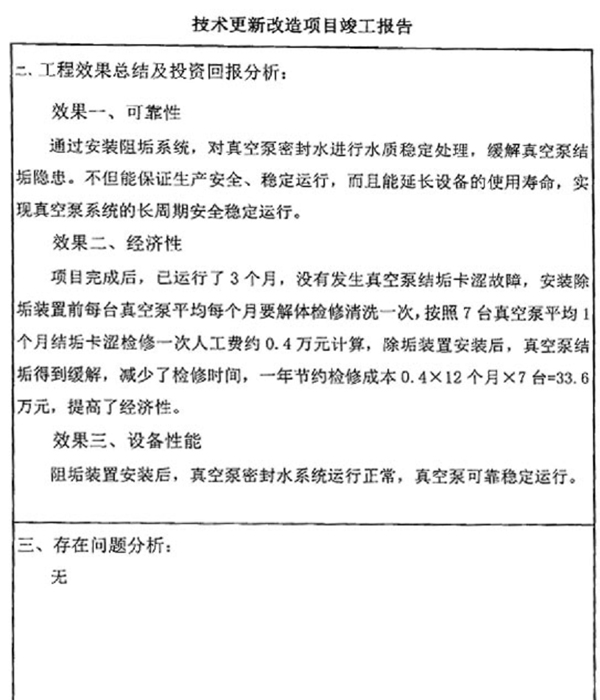 安裝輕雨環(huán)保掃頻電子除垢儀后,東勝熱力公司的結(jié)垢問題得到改善,補(bǔ)水費(fèi)用成本變低,檢修人工費(fèi)用和設(shè)備維修費(fèi)用變低。