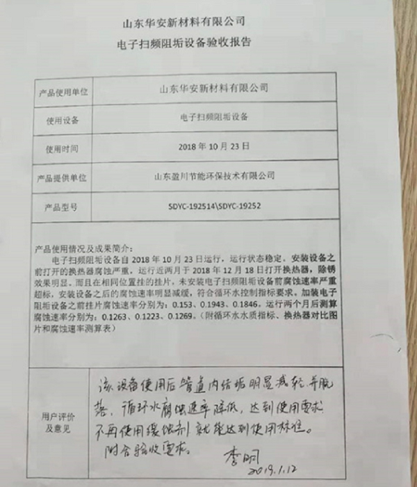華安新材料廠區(qū)電子除垢儀驗(yàn)收?qǐng)?bào)告